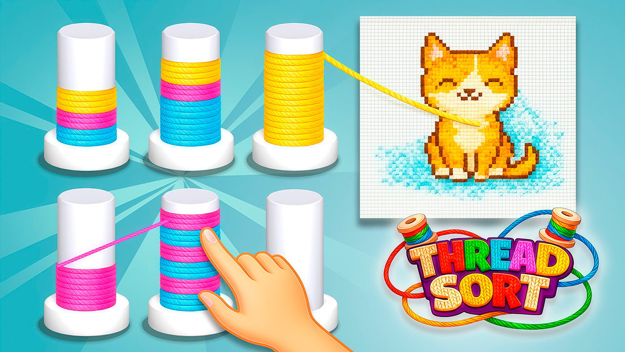 Thread Sort is a relaxing and satisfying puzzle game where you organize colorful threads on spools and turn them into beautiful cross-stitched pictures. Sort mixed threads by color, clear the pegs, and watch as neatly arranged strands automatically stitch a charming image on the canvas. With cozy visuals, smooth animations, and simple controls, Thread Sort is perfect for fans of sorting puzzles, knitting games, and calming casual challenges.Tap a spool to pull the top thread and move it onto another spool with the same color or onto an empty peg. Arrange all threads so that each spool contains only one color. When a spool is filled with a single color, its thread connects to the canvas and begins stitching the picture automatically. Plan your moves carefully to avoid running out of space and complete the artwork.